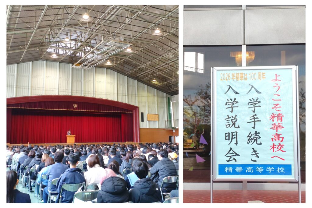 制服の採寸や教科書購入などの手続きのあと、体育館で教務部・生徒指導部・保健室より説明を行いました。全体会に続き、各コースに分かれて説明会を実施しました。