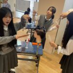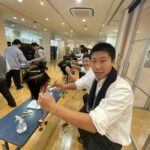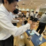 西日本ヘアメイクカレッジでは、講習をしていただいた後、実際にカットの体験をさせていただき、みんな真剣に楽しそうにカットの体験をしていました。また紙の上ですが、マツエクの装着練習も体験できました。