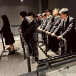 2組は、高齢者体験スーツを身につけ、高齢者の動きや姿勢を疑似体験しました。