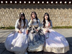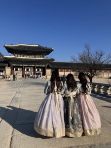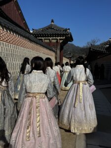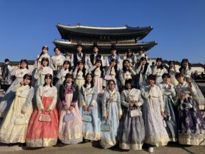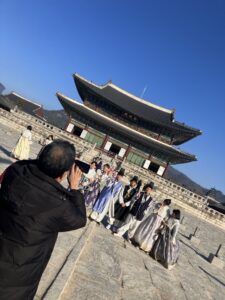 今日はまず、「韓服体験」です。女子はチマチョゴリ、男子はパジチョゴリに着替え、「景福宮」に入場しました。広大な歴史建築では伝統服がよく映えます!最高気温8℃と肌寒かったですが、みんなとてもキレイに、カッコよく着こなしていました。