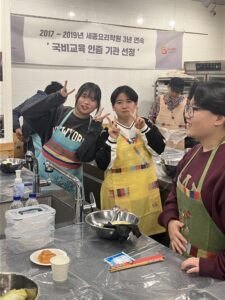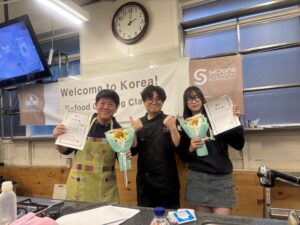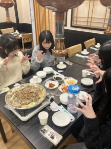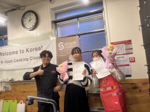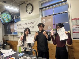 スンドゥブ定食の昼食後は「キムチ作り体験」です。ソウルでも有名な料理講師の指導でみんなでおいしそうなキムチを作ることができました。いろいろな調味料が入っていることがわかりビックリしました!2人でチームを組み、講師の採点で1位〜3位の表彰もありました。帰国後ちょうどいい具合に発酵しているそうで、とても楽しみです!