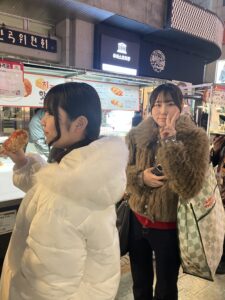 そして「明洞班別自主研修」です。韓国最大の繁華街での散策や買い物は生徒たちにはとても魅力的だったようです。時間が足りないという声が多かったので、「プルコギ」の夕食後、さらににぎやかになった明洞を満喫しました!特に夜はお祭りのように屋台がひしめき合い、韓国B級グルメを楽しんでいました!
