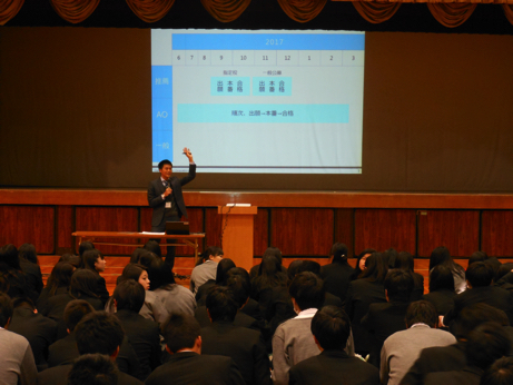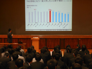 1月18日(水)2年生を対象に進学就職の2会場に分かれて進路説明会を実施しました。 進学希望者については(株)マイナビの青木先生に講演していただきましたが、進路選択のポイントを的確かつ明瞭に話され、今後の大きな指針となりました。 就職希望者については担当教員が、現在の社会情勢及び内定に至るまでのプロセス等詳しく説明しましたが、全員緊張感を持って耳を傾けていました。