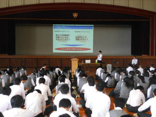 6月1日(水)2限、主権者教育を実施しました。 堺市中区役所より3名の講師の方に来ていただき、18歳が選挙権をもつことに ついてお話しいただきました。 今後、自分たちの未来について積極的に考えるきっかけになってくれればと思います。